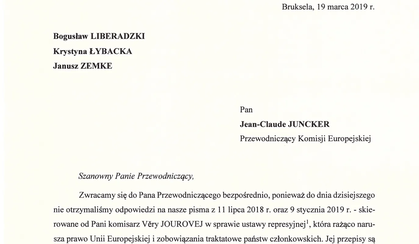 19 marca 2019 r. troje europosłów SLD – Bogusław Liberadzki, Krystyna Łybacka oraz Janusz Zemke – wystosowało pisma do przewodniczących Komisji Europejskiej Jean-Claude Junckera oraz Fransa Timmermansa, informując ich o braku odpowiedzi na swoje wystąpienia do komisarz Very Jourovej.