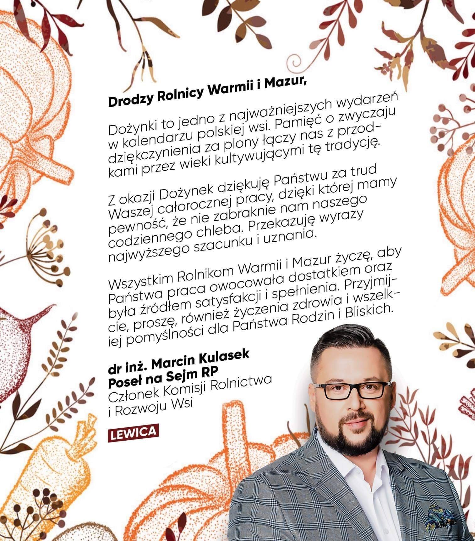Dożynki to jedno z najważniejszych świąt w kalendarzu każdego rolnika. Dlatego w okresie wieńczącym trud z jakim się codziennie mierzycie, serdecznie dziękuję wszystkim rolnikom za pracę oraz życzę samych pomyślnych plonów.
