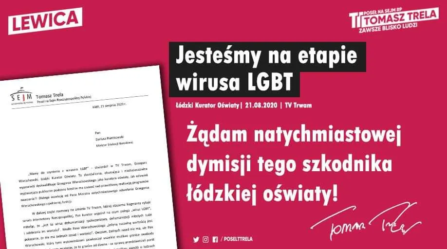 „Mamy do czynienia z wirusem LGBT” – stwierdził w TV Trwam, Grzegorz Wierzchowski, Łódzki Kurator Oświaty. Ta skandaliczna, oburzająca i niedopuszczalna wypowiedź dyskwalifikuje Grzegorza Wierzchowskiego jako kuratora oświaty. Jak człowiek wygłaszający publicznie podobne brednie ma czuwać nad prawidłową realizacją programów nauczania?! Dlatego oczekuję od Pana Ministra natychmiastowego odwołania Grzegorza Wierzchowskiego z pełnionej funkcji.