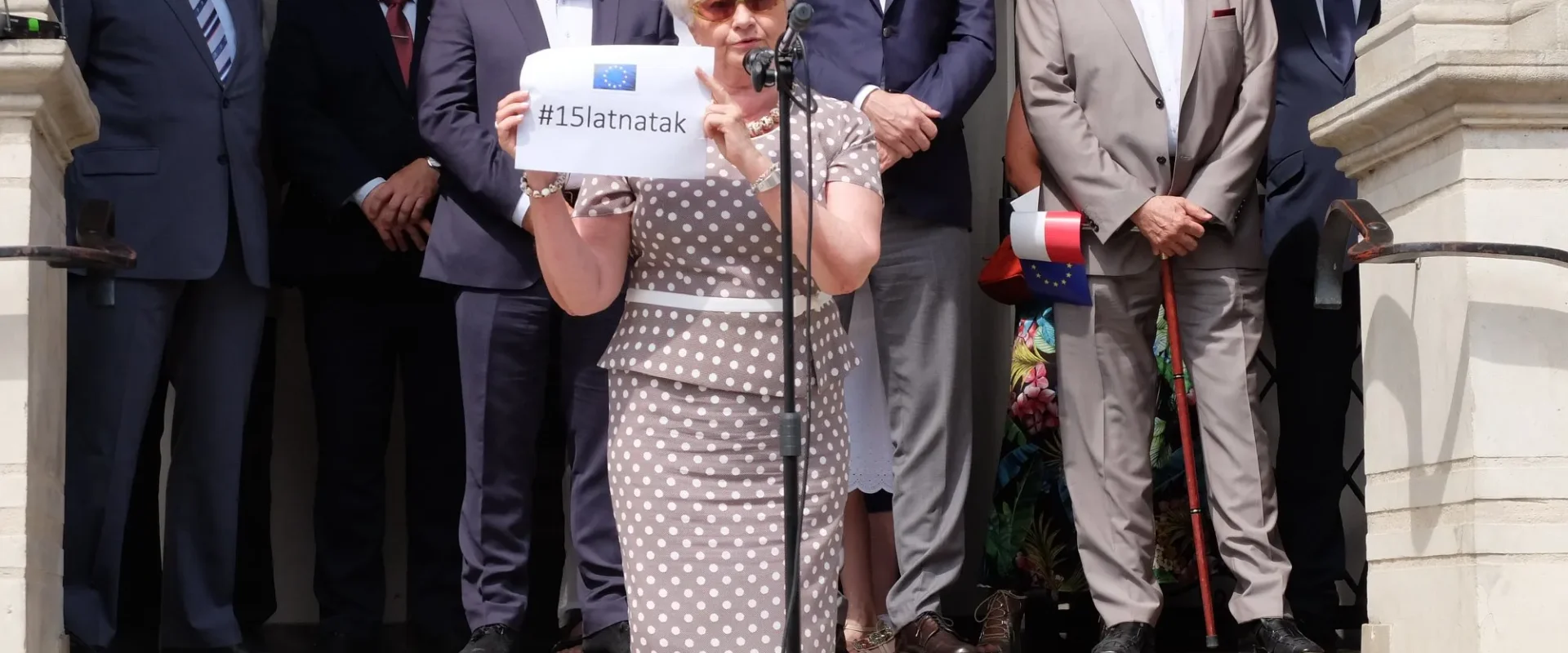 Takiej Polski chcemy, te wartości są dla również dziś aktualne. Z tego powodu zachęcam, podejmując apel pana premiera Leszka Millera, aby wszyscy, którzy uważają, że musimy dbać ciągle oto, aby te wartości były realizowane – zróbmy sobie zdjęcie używając hasła: 15 lat na tak! I umieśćmy je na dowolnym portalu społecznościowym, pokażmy, że jest nasz dużo. Pokażmy, że Polki i Polacy ciągle są na tak dla wolnej, demokratycznej i praworządnej Polski. Pierwszym zdjęciem, będzie zdjęcie uczestników dzisiejszego spotkania.”