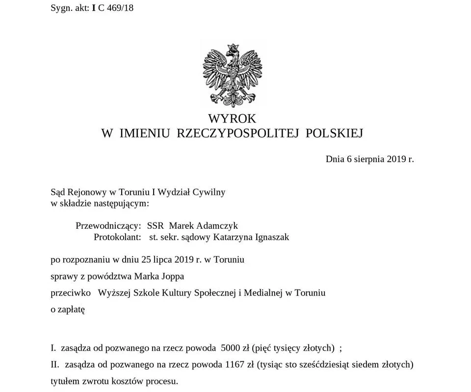 Wyższa Szkoła Kultury Społecznej i Medialnej pośrednio dyskryminowała Marka Joppa, wymagając od niego opinii od proboszcza przy przyjęciu na studia – taki wyrok zapadł dziś przed toruńskim Sądem Rejonowym.
