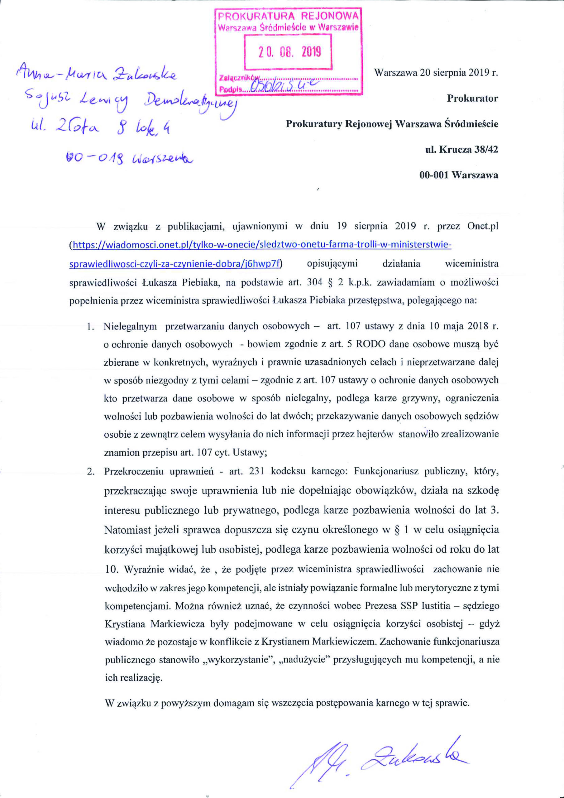 – Składamy więc zawiadomienie do Prokuratury rejonowej Śródmieście . Zawiadamiamy o możliwości popełniania przestępstwa dot. nielegalnego przekazywania danych osobowych oraz podejrzenie o przekroczeniu uprawnień funkcjonariusza publicznego. Składamy też wniosek do Prezesa Danych Osobowych w związku z ustawa RODO – zaznaczyła rzeczniczka prasowa Lewicy.