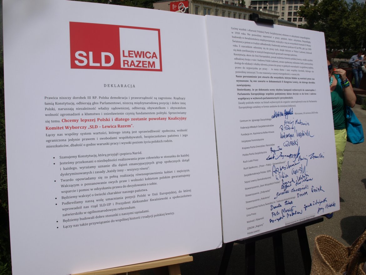 Prawica niszczy dorobek III RP. Polska demokracja i praworządność są zagrożone. Rządzący łamią Konstytucję, odbierają głos Parlamentowi, niszczą międzynarodową pozycję i dobre imię Polski, naruszają niezależność władzy sądowniczej, odbierają obywatelkom i obywatelom wolność zgromadzeń a kłamstwo i zniesławienie czynią fundamentem polityki. Sprzeciwiamy się temu. Chcemy lepszej Polski i dlatego zostanie powołany Koalicyjny Komitet Wyborczy „SLD – Lewica Razem”.Łączy nas wspólny system wartości, którego istotą jest sprawiedliwość społeczna, wolność ograniczona jedynie prawem i swobodami współobywateli, bezpieczeństwo państwa i jego mieszkańców, dbałość o godne warunki pracy i wysoki poziom życia polskich rodzin.